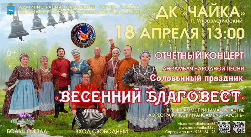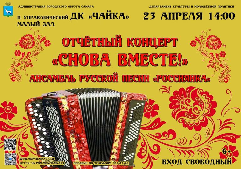 | АфишаУважаемые посетители! Обращайте внимание на место проведения мероприятия, указанное в афише!Все мероприятия 23.04.2026 • Отчетный концерт «СНОВА ВМЕСТЕ!» Ансамбля русской песни «РОССИЯНКА» в ДК «Чайка» п. Управленческий ![]() 24.04.2026 • Поэтический вечер «О, я недаром в этом мире жил» приурочен ко дню рождения Н. А. Заболоцкого» в ДК «Чайка» п. Управленческий ![]() 24.04.2026 • XXV РАЙОННЫЙ ФЕСТИВАЛЬ ВЕТЕРАНСКИХ ХОРОВКРАСНОГЛИНСКОГО РАЙОНА «ЕДИНЫЙ НАРОД - ЕДИНАЯ СТРАНА», посвященный ЕДИНСТВУ НАРОДОВ ПОВОЛЖЬЯ в ДК «Чайка» п. Управленческий ![]() 25.04.2026 • РЕТРО КИНОПОКАЗ музыкальной комедии «Кубанские казаки» в ДК «Чайка» п. Управленческий ![]() 27.04.2026 • Тематическая программа «Чернобыль - память, которая не гаснет», посвященная 40-летней годовщине аварии на Чернобыльской АЗС в ДК «Чайка» п. Управленческий ![]() 28.04.2026 • Водевиль «Уж замуж невтерпёж», в рамках театральный гостиной в ДК п. Мехзавод ![]() 29.04.2026 • Концертная программа «И в танце будет жизнь моя», посвященная Международному дню танца в ДК «Чайка» п. Управленческий ![]() 30.04.2026 • АФИША на АПРЕЛЬ в ДК «Чайка» п. Управленческий ![]() ![]() 30.04.2026 • АФИША на АПРЕЛЬ в ДК п. Мехзавод ![]() 02.05.2026 • МУЗЫКАЛЬНАЯ ГОСТИНАЯ Концертная программа Взрослого хора академии Наяновой «И жизнь и слезы и любовь» в ДК п. Мехзавод ![]() 04.05.2026 • Областная художественная выставка «ПОРТРЕТ» в ДК «Чайка» п. Управленческий ![]() 17.05.2026 • Персональная художественная выставка В.И. Башкирова «Художник и момент. Приглашение к диалогу» в ДК «Чайка» п. Управленческий ![]() |